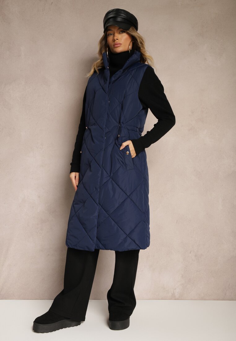Vestă Lungă Bleumarin cu Cusături Matlasate cu Guler Înalt și Buzunare Avalithe